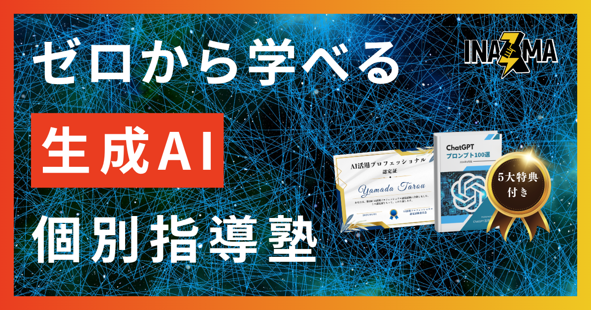 イナズマ塾 | 生成AI専門の完全個別指導スクール生成AIを専門とした完全個別指導のスクール。初心者から上級者まで、あなたのペースで学べます。